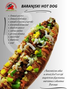 - Baranjski hot dog – domaće pecivo i kobasica, umak od pečene paprike, pržena slanina, kukuruz, kiseli krastavci i senf, sve posluženo kao „street food“ specijalitet u duhu Baranje